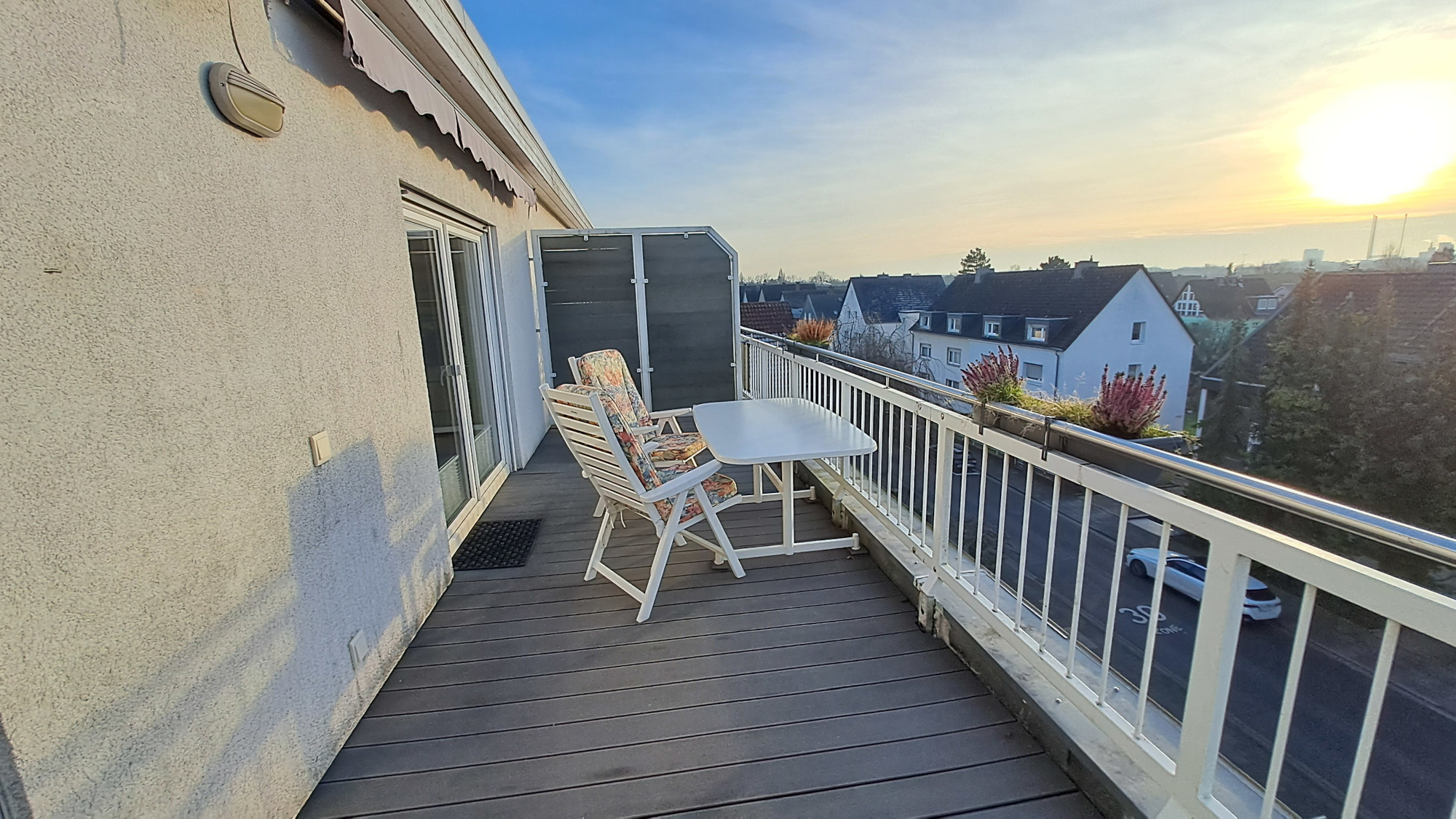Einzigartige Aussicht: Genießen Sie entspannte Abende auf Ihrem weitläufigen Sonnenbalkon. Dank der optimalen Ausrichtung fangen Sie hier die späte Nachmittags- und Abendsonne ein, während Sie den Panoramablick auf das illuminierte Bayerkreuz – das Wahrzeichen der Stadt – bewundern.